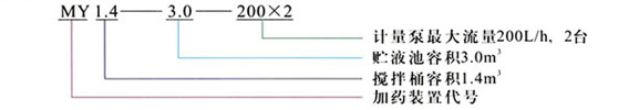 1、MY型加药装置系为化学除油器配套的溶药、贮药、投药设备,也适用于投加各种混凝剂,该装置主要油搅拌桶、贮液池、计量泵组成,其型号意义为: